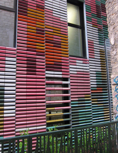 该项目的外立面采用了五颜六色的釉面陶百叶,除了遮阳,又起到了绝佳的装饰作用。打破常规的安装方式也让建筑物变得与众不同。